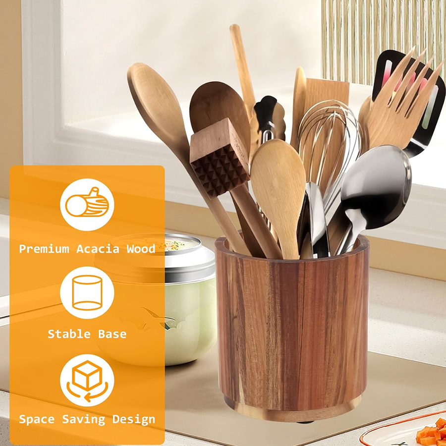 A wooden utensil holder designed for kitchenware brands, importers and retailers that need practical countertop storage with a cleaner, more premium presentation.
