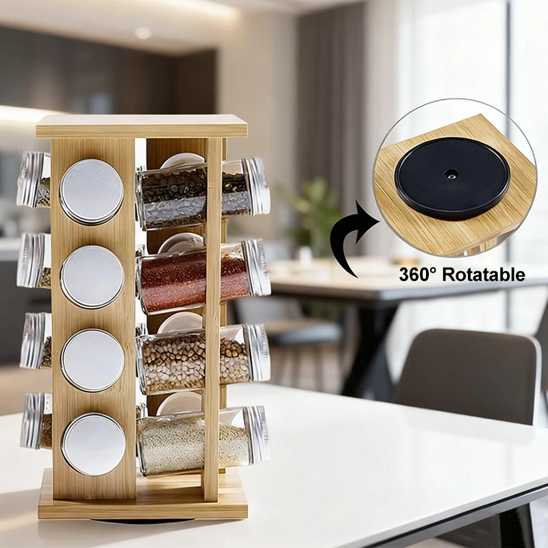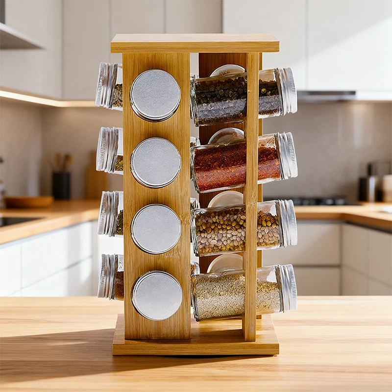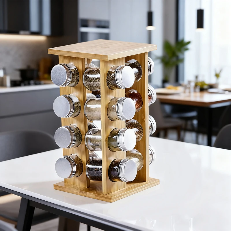This bamboo rotating spice rack is manufactured in China by a professional bamboo kitchenware factory. Designed for brands, distributors, and retailers, it combines a compact vertical structure with practical spice jar storage, offering an efficient and visually clean solution for kitchen organization.