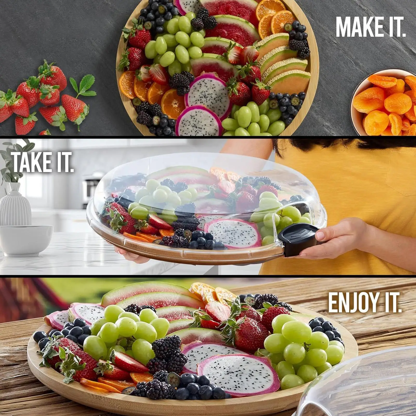 Additionally, the transparent PET cover included with the platter serves multiple purposes. It keeps food fresh and protected from insects, making it perfect for outdoor events. It also allows guests to see the beautifully arranged food without having to lift the cover, keeping everything neat and inviting.
