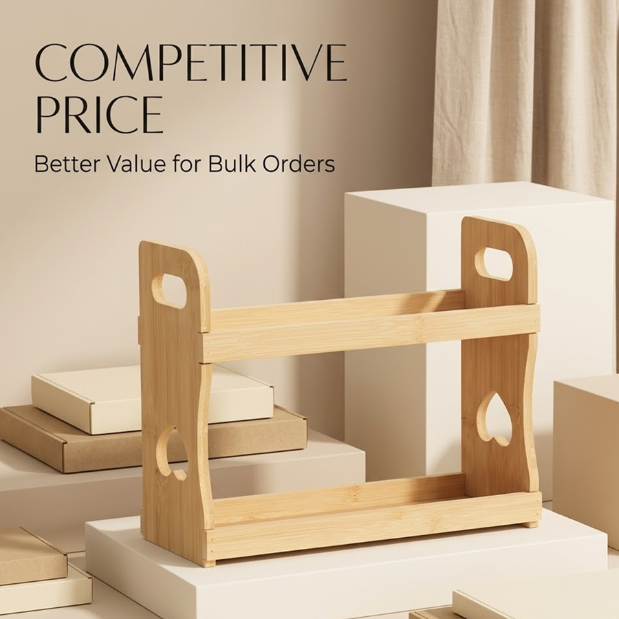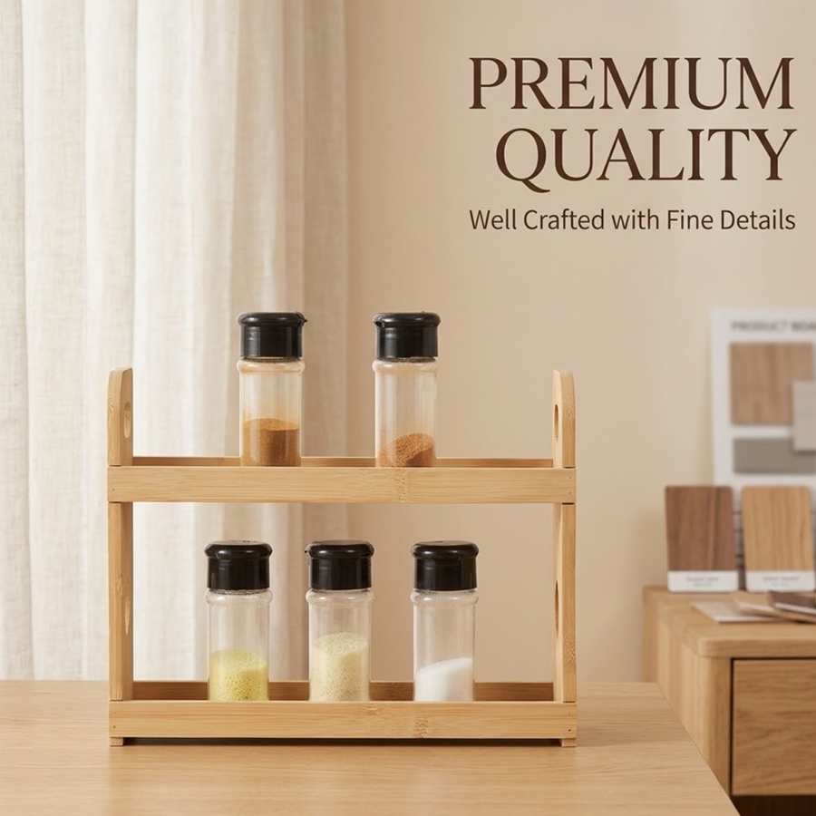 This model can be positioned in several ways, such as a bamboo spice rack organizer, wooden seasoning holder, countertop spice rack, spice jar holder or kitchen organizer shelf. That makes it more flexible for SEO driven product pages and broader collection planning.