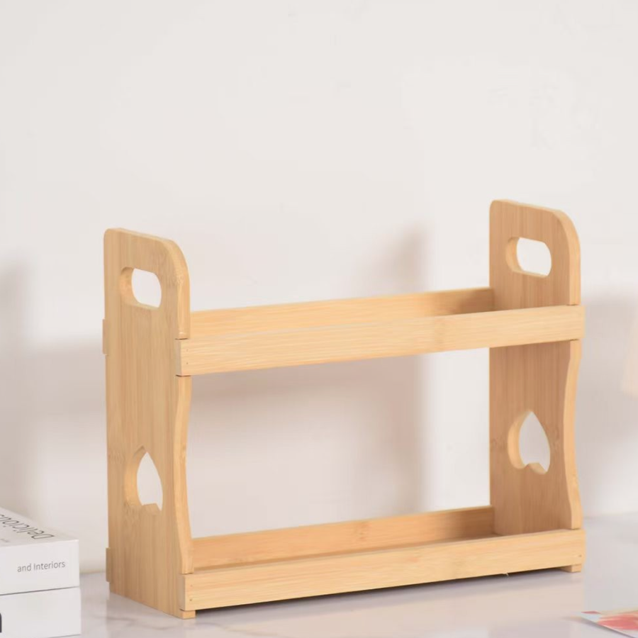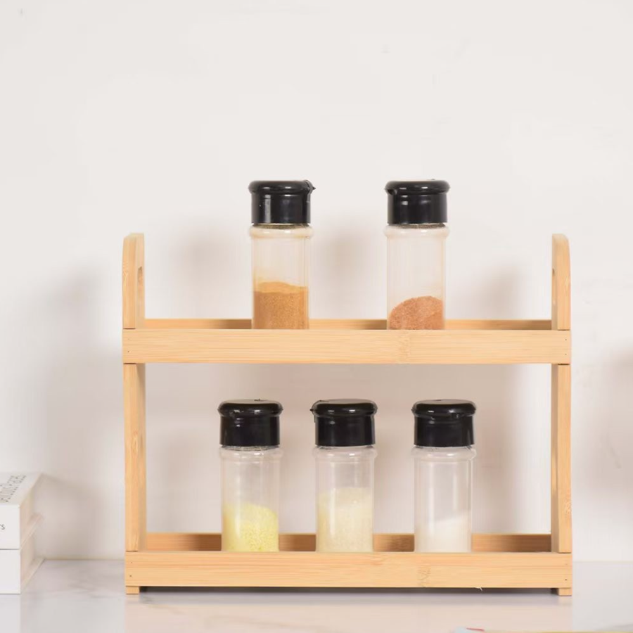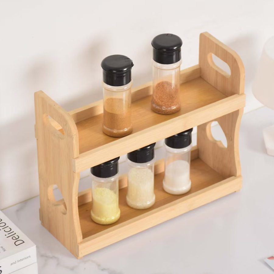 The design is clean and practical. It uses a two tier open shelf structure, which helps buyers offer an item that stores spice jars neatly without taking too much countertop space.