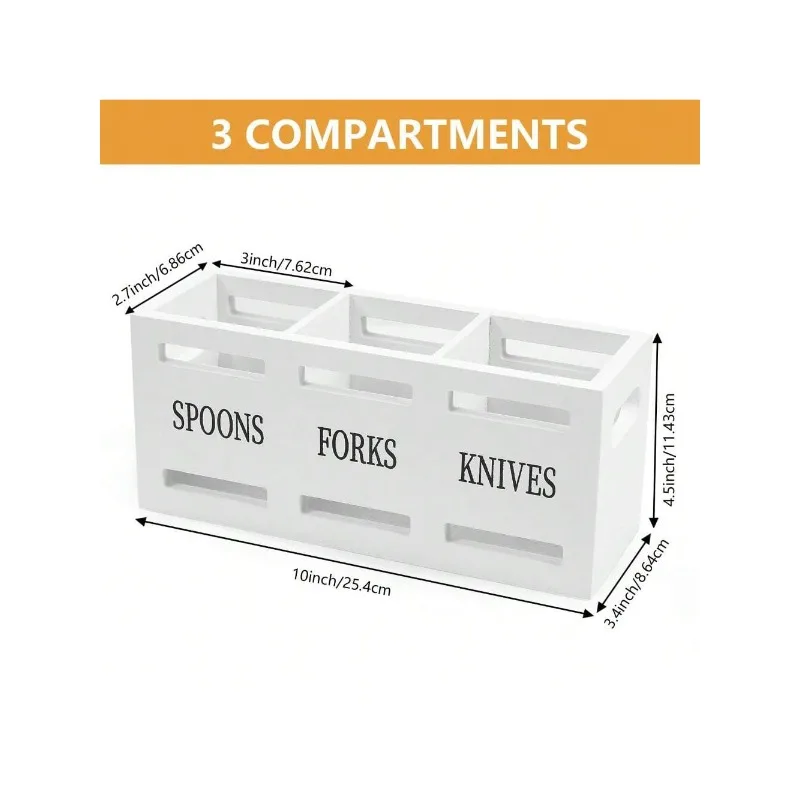 This Wooden Cutlery Holder with Compartments is designed to keep kitchen utensils neatly organized and easily accessible on the countertop. Featuring a clean rectangular shape and a white painted finish, this organizer provides separate compartments for spoons, forks, and knives.