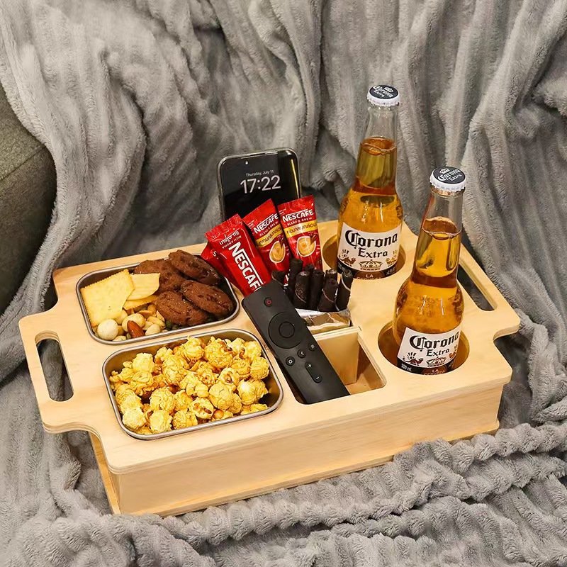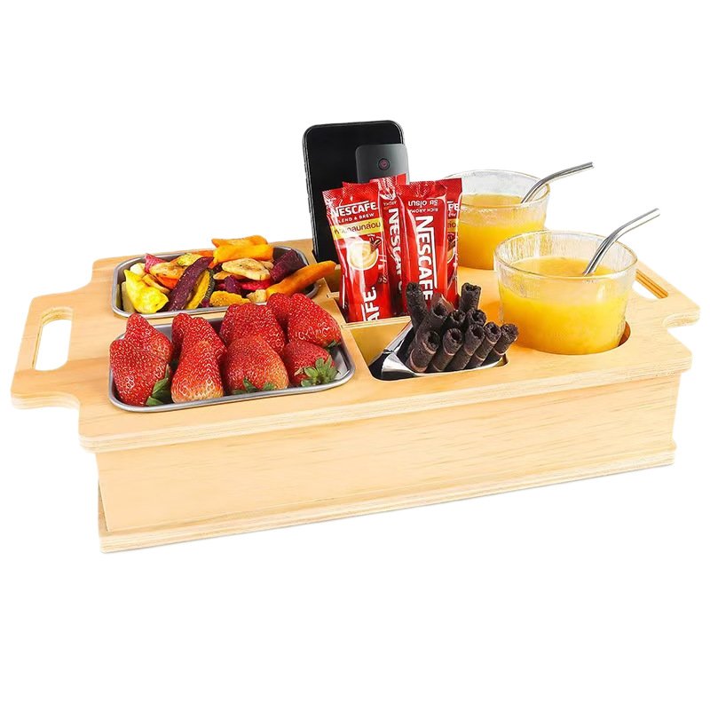 The tray features multiple sections for drinks, snacks, small items, or table accessories. Removable wooden dividers allow flexible compartment adjustment to suit different usage scenarios. The stainless steel inserts are easy to clean and suitable for food contact, making the tray ideal for both home and commercial use.