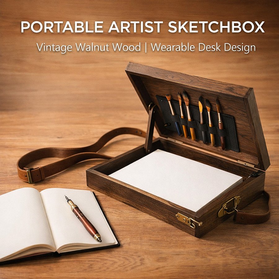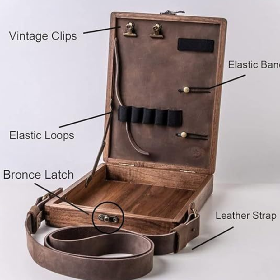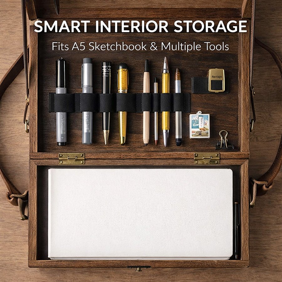 Q: Is the strap strong enough? My clients worry about the box falling off while walking. A: We use reinforced metal D-rings and premium leather/heavy-duty canvas for the straps. It’s designed to be worn like a messenger bag and is tested to hold the weight of a full sketchbook and professional brass pens without any issue.