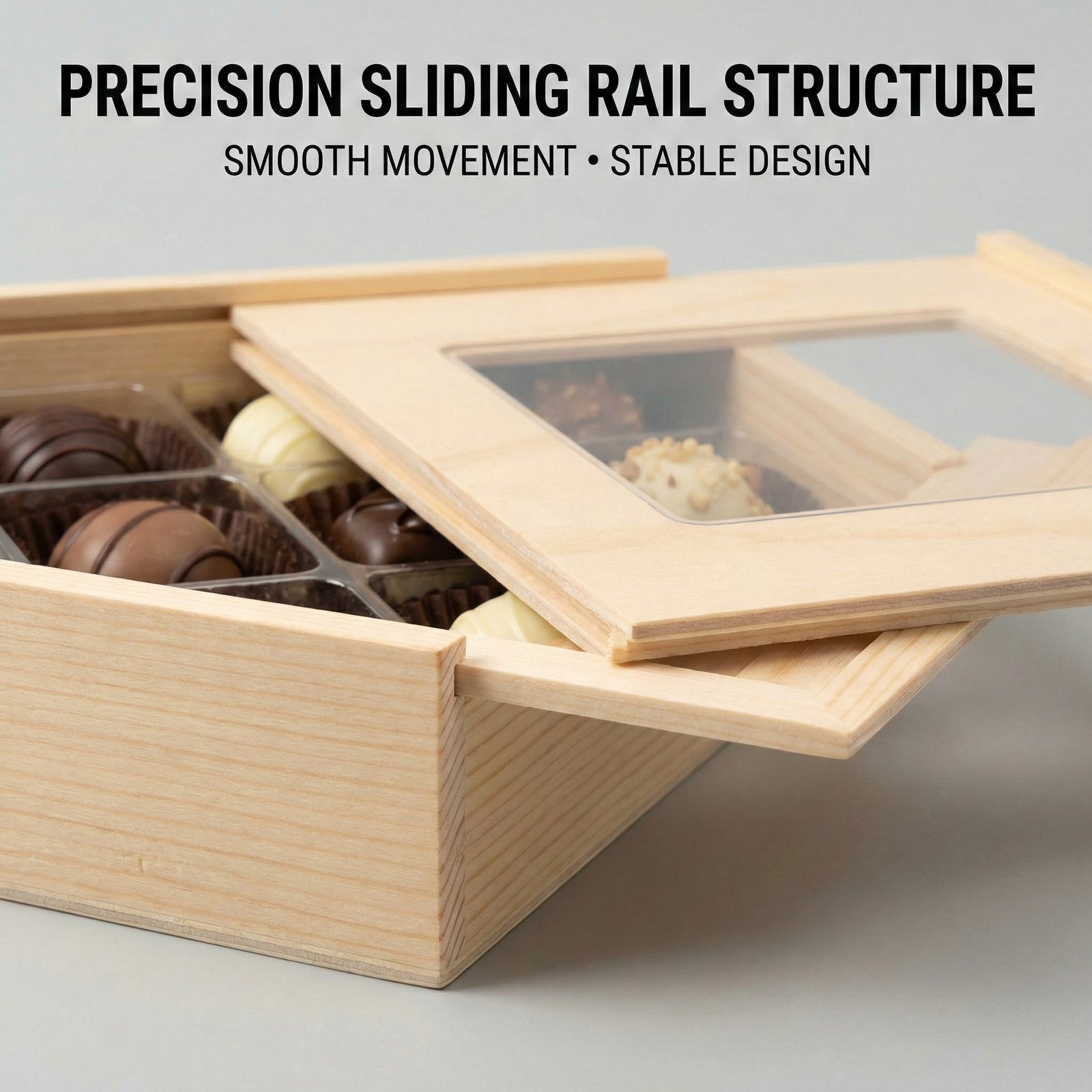 For chocolate brands that want customers to see the product before opening, a sliding lid wooden chocolate box with acrylic window offers both protection and retail visibility.