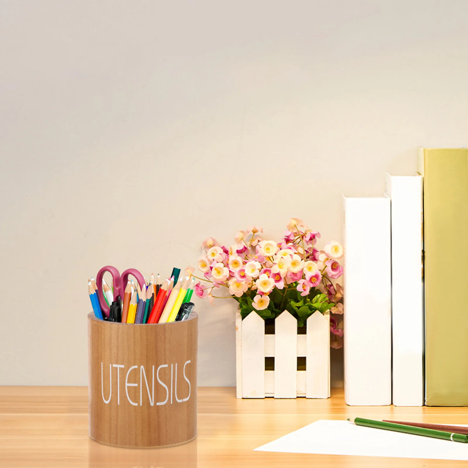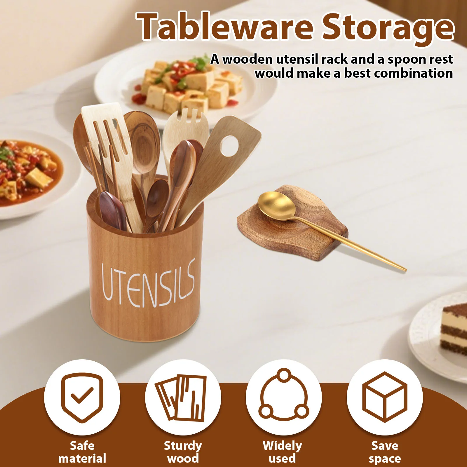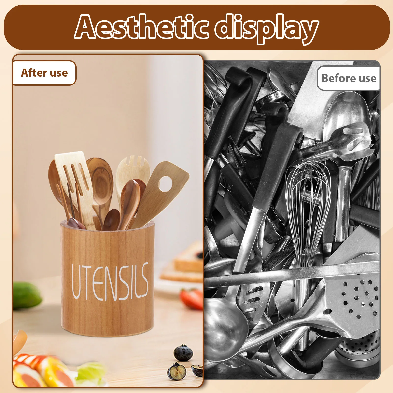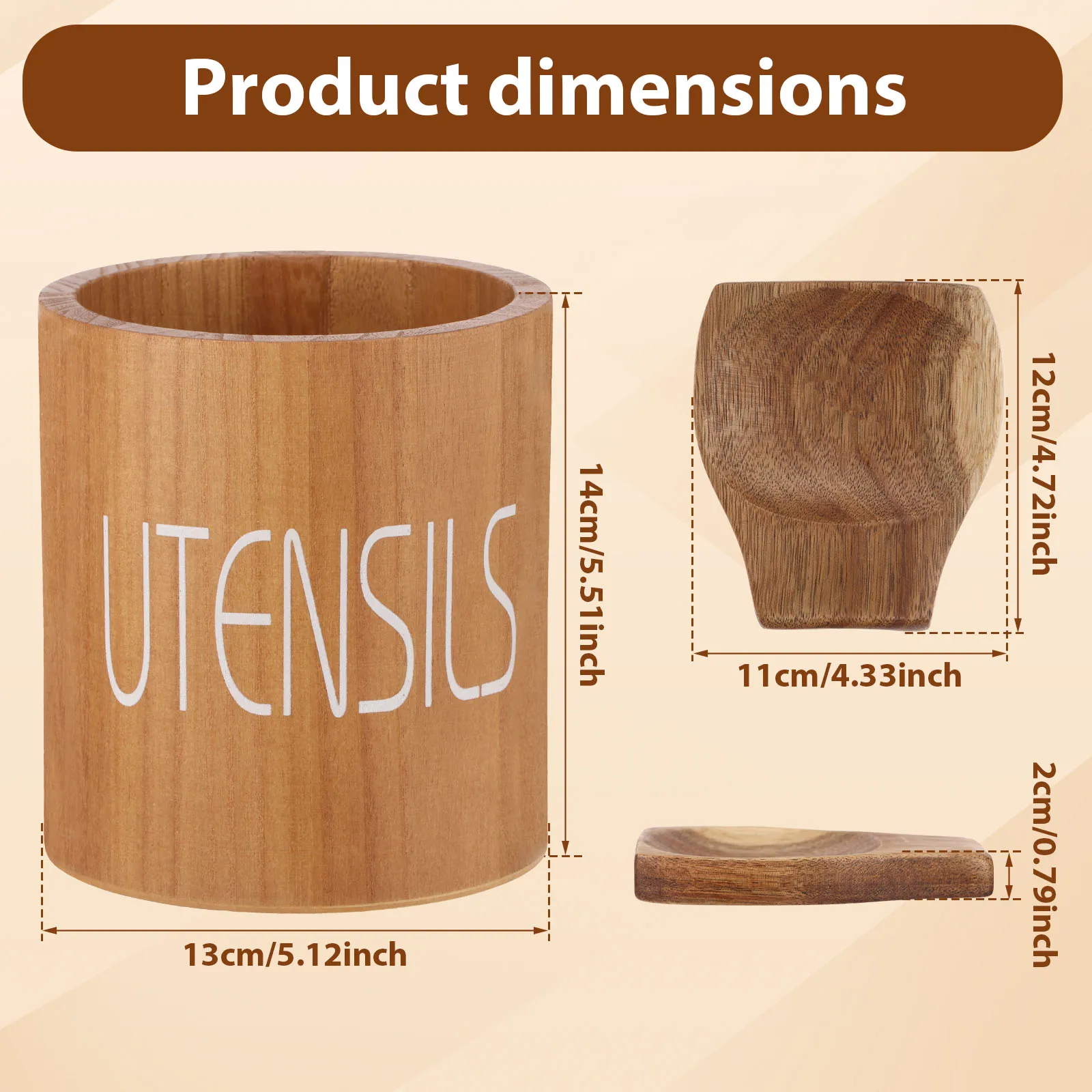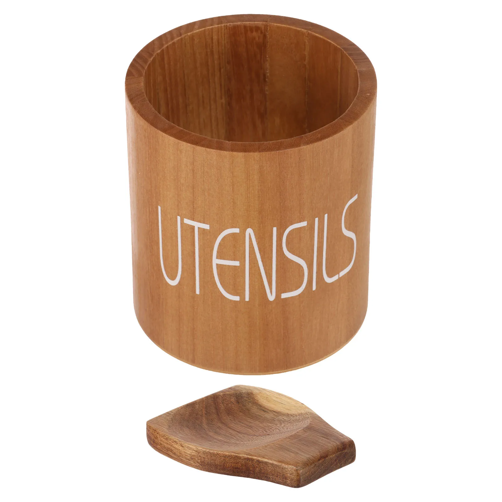 The smooth cylindrical structure allows easy access from all sides, while the printed “UTENSILS” text adds a clean and decorative touch. With its natural finish and warm wood tone, this utensil holder fits seamlessly into modern, farmhouse, and minimalist kitchen interiors.