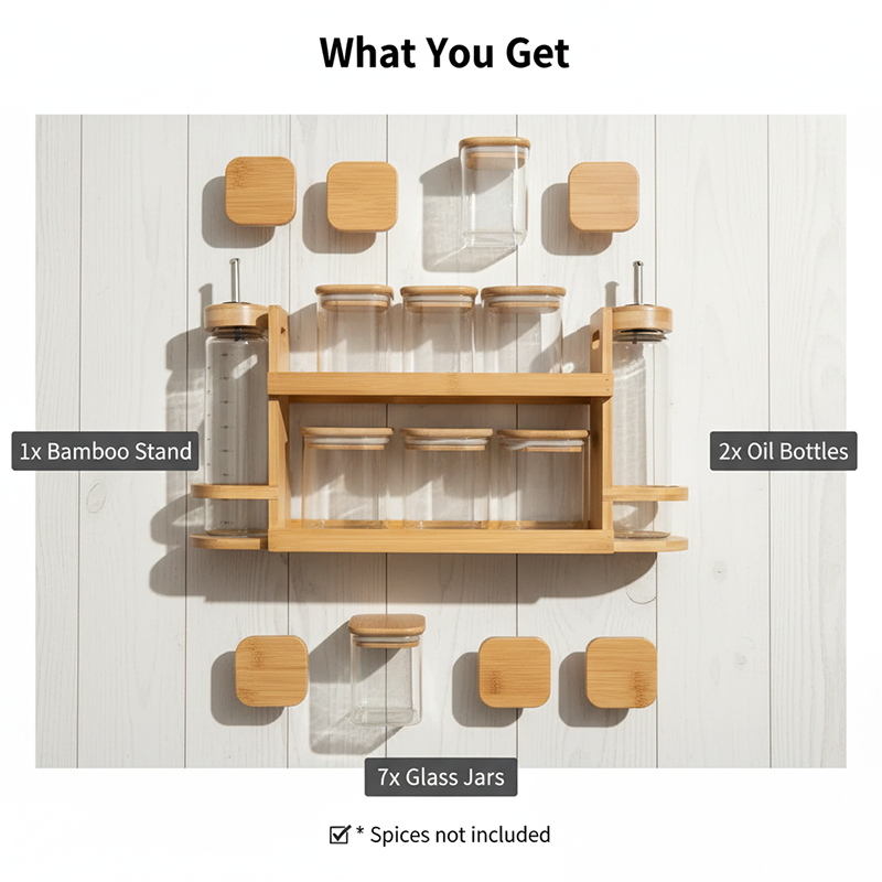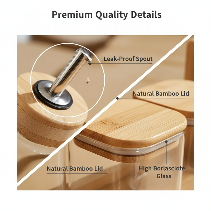 Airtight & Fresh: Each small jar features a bamboo lid with a silicone ring seal to lock out moisture and keep your spices potent and fresh. The oil bottles come with stainless steel/plastic pour spouts for mess-free cooking.
