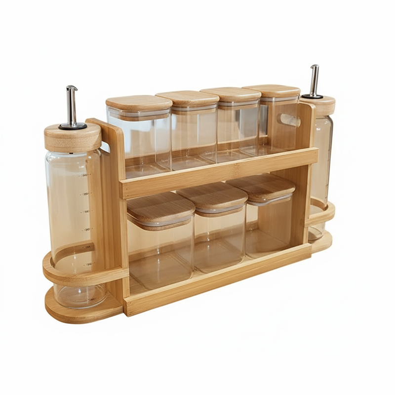 Premium Materials: The stand is crafted from sustainable, water-resistant bamboo, making it durable for kitchen environments. The containers are made from high borosilicate glass, which is clearer and stronger than standard glass.