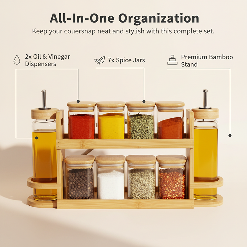Smart Design: The 2-tier design maximizes vertical space on your countertop. The dedicated slots for the oil bottles ensure they stay stable and don’t tip over.
