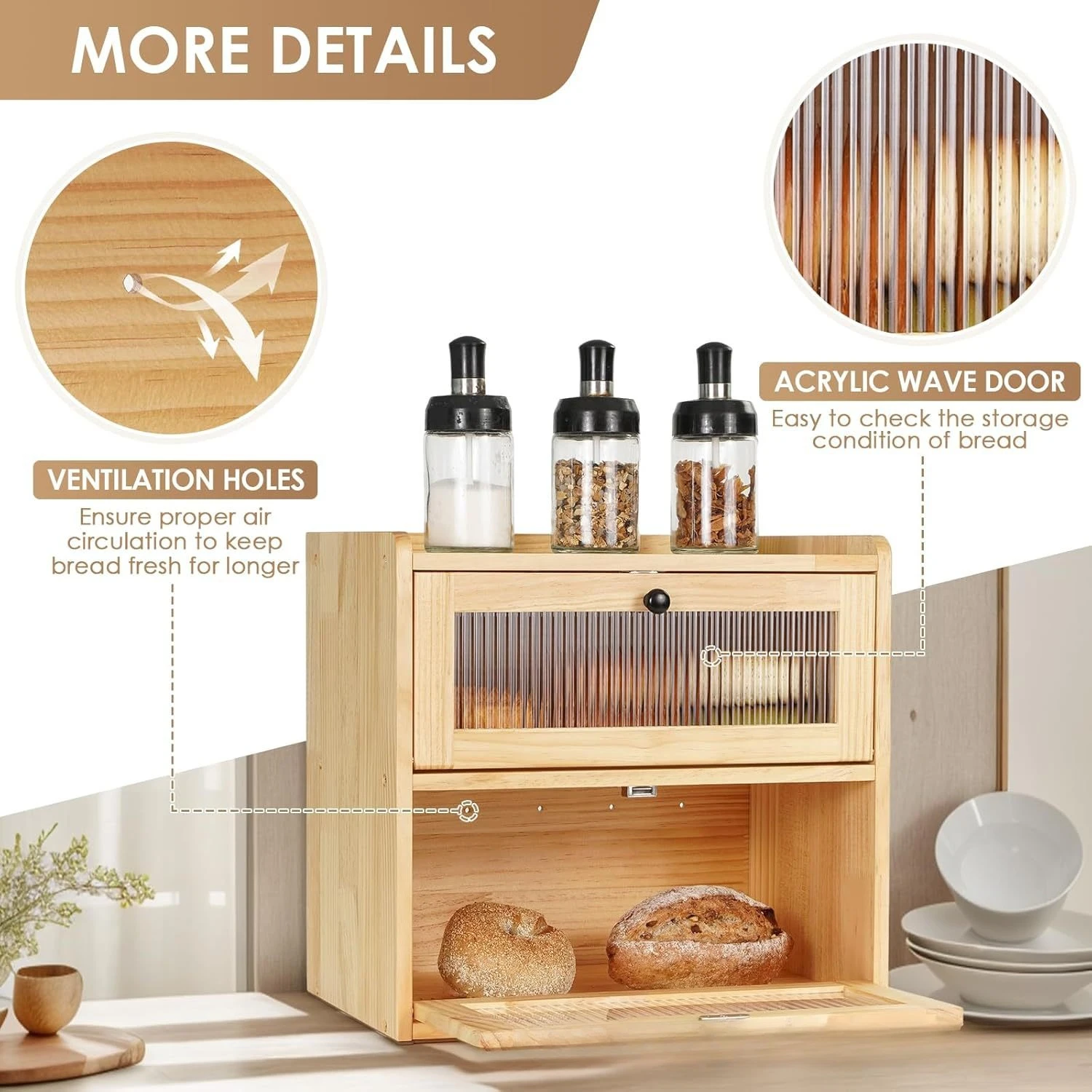 The enclosed structure helps shield bread from dust and air, while allowing enough circulation to prevent moisture buildup. Compared to open storage, this wooden bread box helps maintain bread quality for everyday household use.