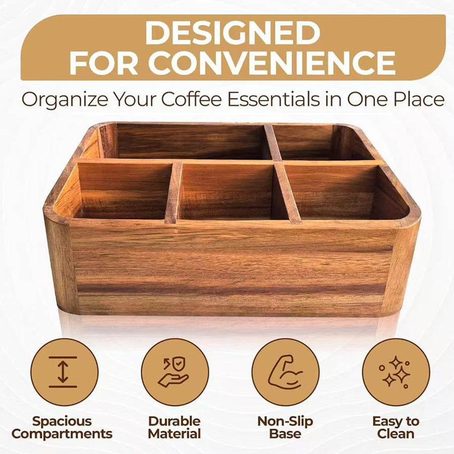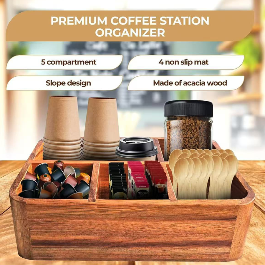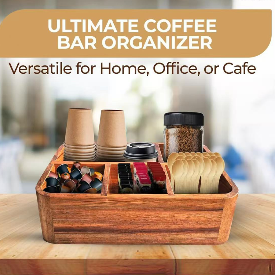 Importers and wholesalers looking for wooden coffee bar organizers with stronger countertop appeal than plastic alternatives.