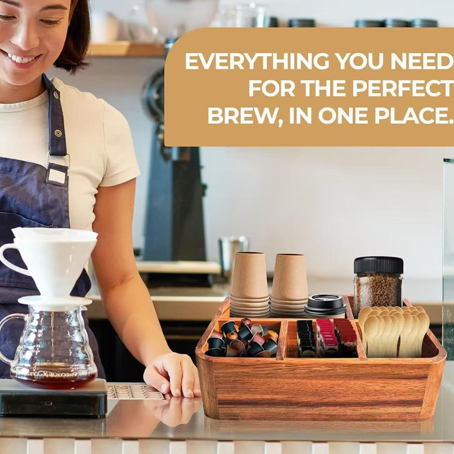 This wooden coffee station organizer is designed to simplify coffee service in a compact footprint. The divided layout makes it easier to separate pods, sachets, stirrers, cups and other small items without creating countertop clutter.