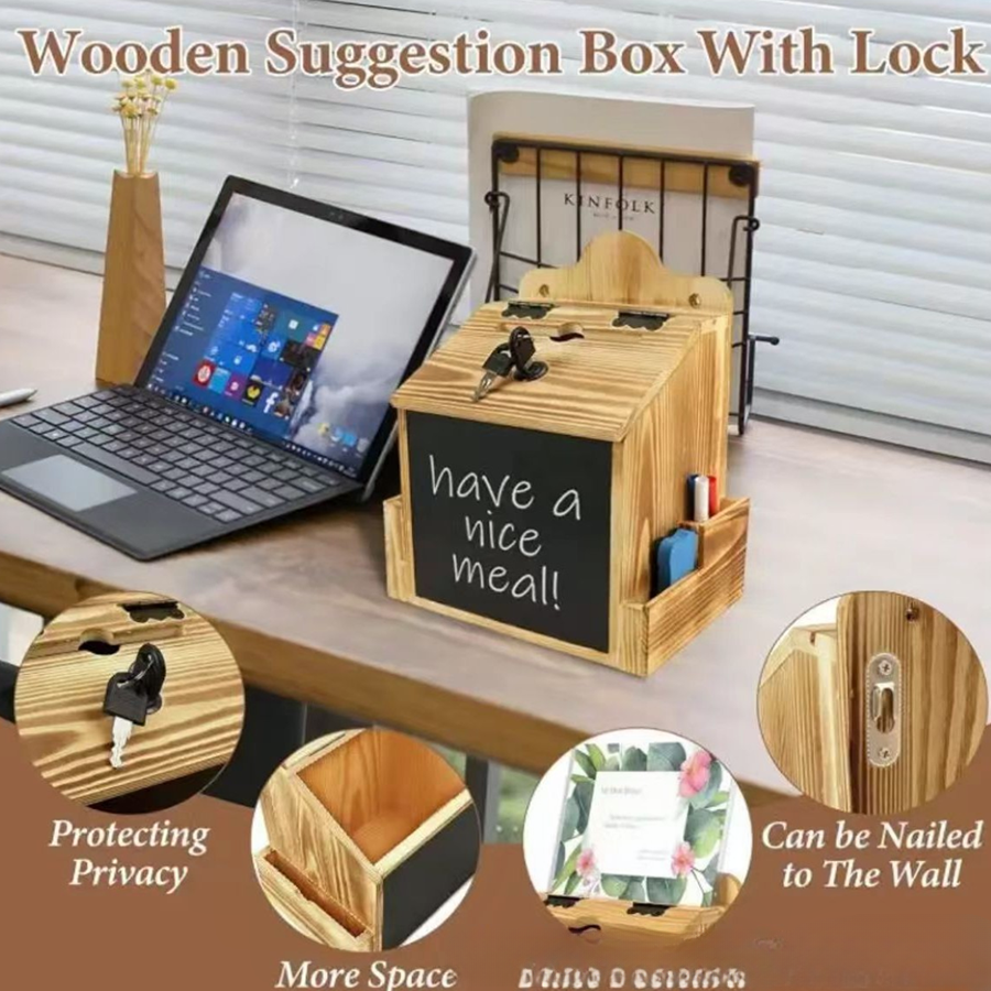 A practical wooden comment box for feedback collection, ballot use, donation campaigns, and branded display projects.