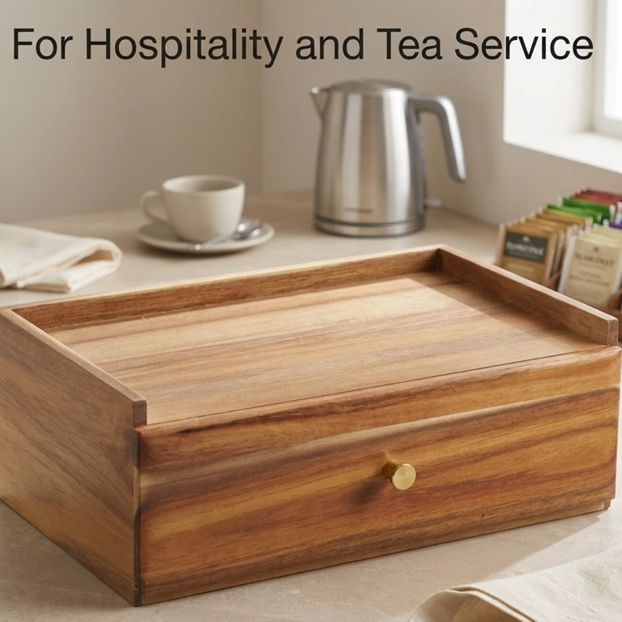 The second advantage is structure. The combination of tray and drawer gives more function than a simple tea chest, allowing different tea bag types or small service items to be arranged more clearly.